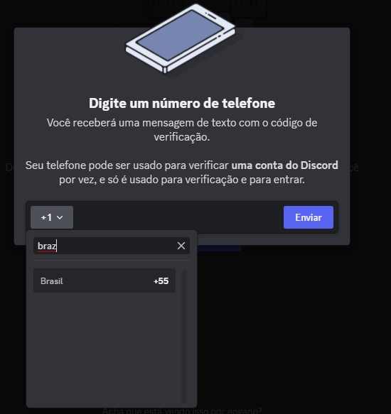 Você vai clicar com a seta pra baixo, vai digitar Brazil ou +55, depois ao lado você vai colocar o seu numero de telefone com DDD. exemplo 21 ****-**** e vai clicar em enviar no botão azul, assim o discord vai enviar um sms para seu celular com 6 dígitos (números) que você vai por no campo em que eles pedem e confirmar e pronto, já tem acesso ao discord: