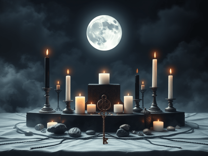1️⃣ Prepare seu Altar: Coloque velas preta e branca, incenso e algum símbolo de Hekate (chave, imagem, pedra).