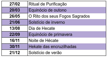 O Deipnon (Jantar/Ceia) de Hekate acontece na noite mais escura, honrando a “Portadora da Luz” com uma doação de comida nas encruzilhadas. É um tempo de purificação de si e do lar.